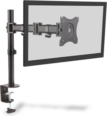 Universele bureausteun voor één monitor tot 27" met een draagvermogen van 8 kg biedt ergonomische afstelling, 360° rotatie (pivot) en kanteling ±45°. Montage via een stevige tafelklem, compatibel met VESA 75x75 en 100x100. Geïntegreerd kabelbeheer houdt de werkplek netjes en overzichtelijk.