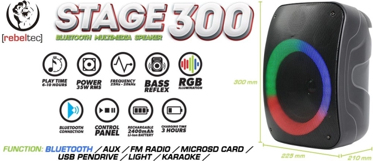 De Bluetooth-luidspreker Stage 300 is de ideale metgezel voor alle muziekliefhebbers die van hun favoriete muziek willen genieten, thuis en onderweg. Dankzij de compatibiliteit met Bluetooth 5.0 kun je eenvoudig muziek afspelen vanaf je smartphone.