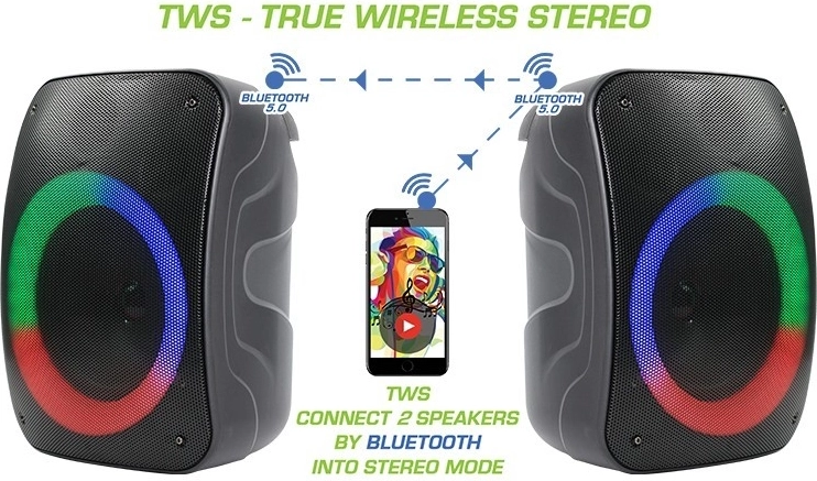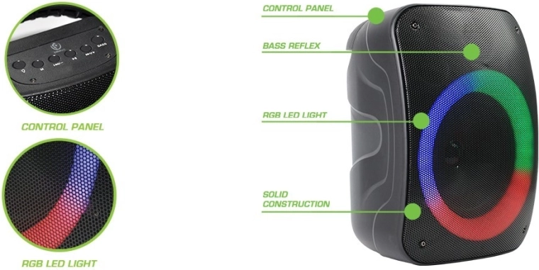 - Verschillende modi: Bluetooth, FM-radio, USB-stick, microSD-kaart, AUX, karaoke.