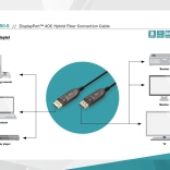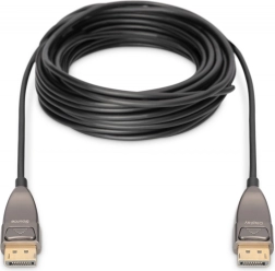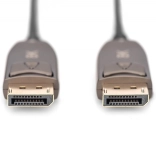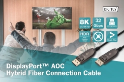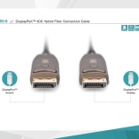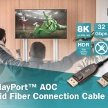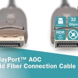 De actieve hybride DisplayPort 1.4 AOC-kabel maakt overdracht van ongecomprimeerd beeld en geluid over lange afstanden mogelijk met een bandbreedte tot 32,4 Gb/s, resolutie tot 8K bij 60 Hz en ondersteuning voor HDR. Dankzij de combinatie van glasvezels en koperen geleiders is hij bestand tegen EMI-storingen, heeft hij een kleine diameter, eenvoudige Plug & Play-installatie en ondersteunt hij HDCP 2.2, EDID en CEC.