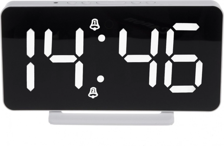De moderne LED‑wekker met spiegelende frontplaat is ideaal voor slaapkamer, woonkamer en kantoor. Hij biedt drie weergavemodi: vloeiende afwisseling van tijd, datum en temperatuur; permanente weergave van de gekozen waarde; of permanente weergave van de tijd met de mogelijkheid van een snelle blik op datum of temperatuur. Dankzij de grote witte cijfers is de tijd ook vanaf grotere afstand goed af te lezen.