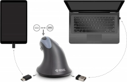 Dankzij de doordachte helling en hoogte bereik je intuïtief alle bedieningselementen – het scrollwiel, de DPI-schakelaar en de zijknoppen. De draadloze verbinding op 2,4 GHz zorgt voor een stabiele en snelle respons, de nano USB-ontvanger is altijd bij de hand en er is ook een USB‑C-adapter inbegrepen voor moderne laptops.