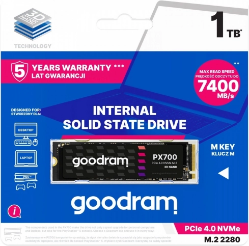 GOODRAM PX700 verlegt de snelheidsgrenzen in het NVMe SSD-segment. Het benut het volledige potentieel van PCIe 4.0 x4, waardoor laadtijden voor games, systeemboot en werken met grote bestanden aanzienlijk worden verkort. De laagprofiel grafenen heatsink zorgt voor betrouwbare koeling zonder onnodige toename in afmetingen.