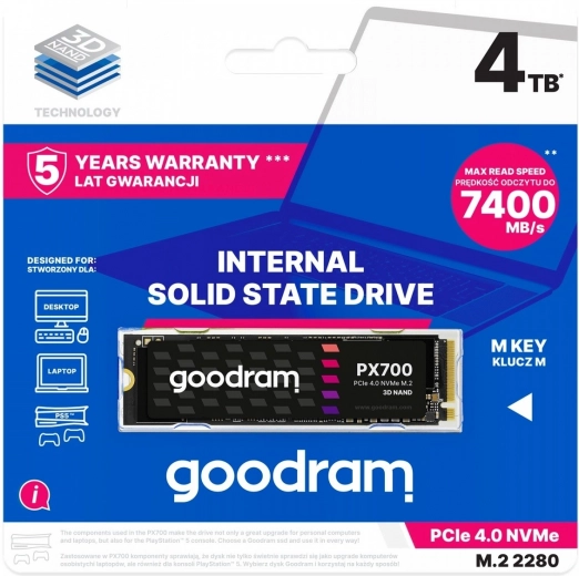 De GOODRAM PX700 verlegt de grenzen van opslag dankzij PCIe 4.0 x4 en het NVMe-protocol, wat zorgt voor bliksemsnelle systeemprestaties, snelle laadtijden van games en vlotte omgang met grote bestanden. Met de capaciteit van 4 TB sla je moeiteloos uitgebreide gamebibliotheken, 4K/8K-video en professionele projecten op.