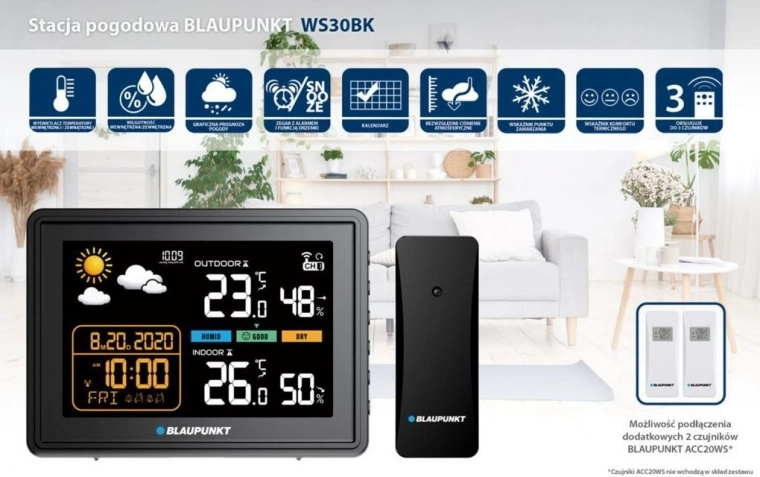 Geen probleem. Het station ondersteunt tot drie externe sensoren, dus naast de meegeleverde sensor kun je nog twee optionele Blaupunkt ACC20WS-sensoren aanschaffen. Stel ze in op de juiste kanalen (de sensoren hebben 3 handmatig schakelbare kanalen) zodat de signalen elkaar niet storen, en gebruik ze waar je maar wilt. Wil je temperatuur en vochtigheid in de slaapkamer, garage of in de voorraadkast op de binnenplaats monitoren? Laat daar een sensor staan en lees de gemeten waarden af op het display van het WS30BK weerstation. Met optionele ACC20WS-sensoren kun je de temperatuur- en vochtigheidswaarden ook op het lcd-display bekijken, waar je ze ook plaatst.