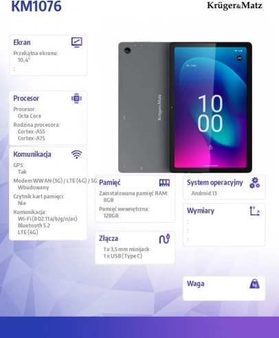 Ontdek prestaties en elegantie met de Kruger&Matz EAGLE 106, voorzien van een 10,4-inch scherm met IPS-technologie voor een helder en scherp beeld vanuit elke hoek. Het hart van het apparaat is een octa-core MT6789-processor en 8 GB RAM, die zorgen voor een vloeiende werking, zelfs bij veeleisende taken.