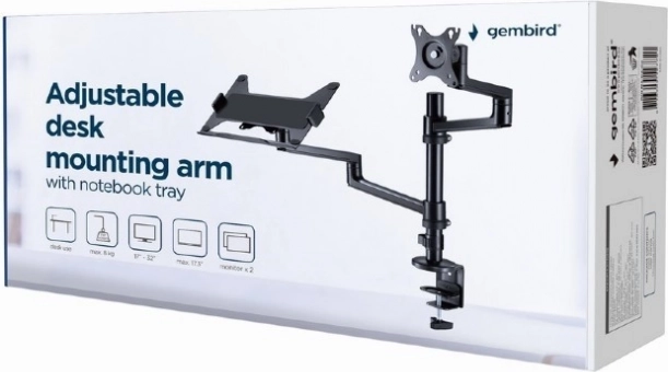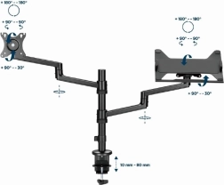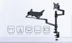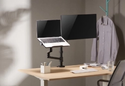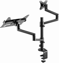Eén arm voor een monitor van 17–32" (VESA 75×75/100×100), de andere met legvlak voor een laptop tot 17,3". Bespaar ruimte en creëer een perfect afgestemde werkopstelling.