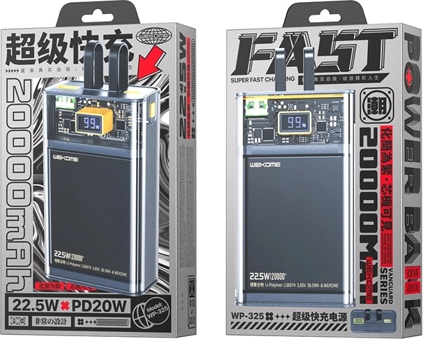 Stijlvolle en robuuste WEKOME Vanguard Series powerbank met een capaciteit van 20000 mAh biedt supersnel laden via PD 20 W en QC 22,5 W, twee ingebouwde USB‑C- en Lightning-kabels en een LED-display voor een duidelijk overzicht van de resterende energie. Dankzij geavanceerde beveiligingen laad je veilig meerdere apparaten tegelijk op, terwijl de compacte afmetingen het meenemen gemakkelijk maken.