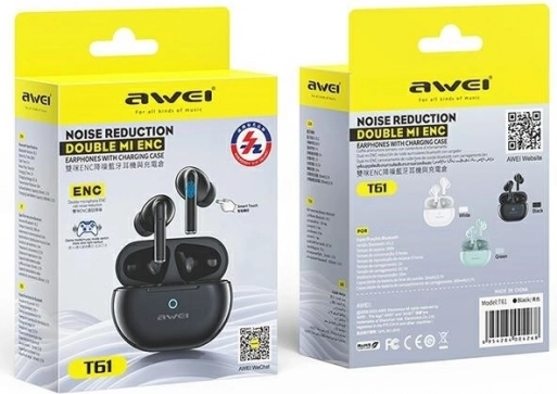 Compacte draadloze TWS-oordopjes Awei T61 in elegante zwarte kleur bieden een stabiele Bluetooth 5.3-verbinding, IPX6-waterbestendigheid en tot 6 uur luistertijd op één lading. Comfortabele siliconen tips en een microfoon met dubbele ruisonderdrukking zorgen voor prettige gesprekken, ook tijdens het sporten.