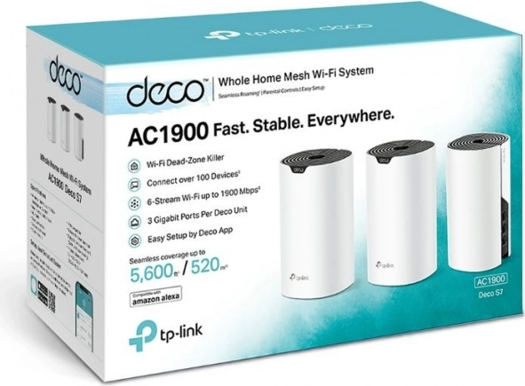 De Deco S7 AC1900 levert krachtige en stabiele netwerkdekking dankzij de installatie van drie units, die dode zones elimineren en naadloze dekking in alle kamers bieden.