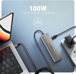 De aluminium behuizing verhoogt de duurzaamheid en helpt bij de koeling. De hub ondersteunt Plug & Play, Hot Plug en verbinding met telefoons met USB‑C. Sluit eenvoudig een flashdrive, toetsenbord, muis, externe schijven of monitor/TV/projector aan.