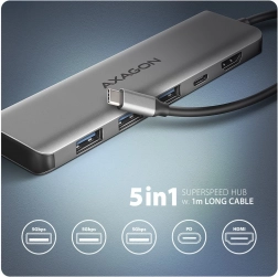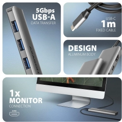 Breid de mogelijkheden van je moderne laptop uit met één kabel. Deze multi‑poort USB‑C hub biedt hoge datasnelheden via USB 3.2 Gen 1 (5 Gb/s), vloeiende weergave via HDMI tot 4K/30 Hz en gelijktijdige voeding via USB‑C PD 100 W. Met de 1 meter lange vaste kabel heb je flexibiliteit in de plaatsing op je bureau.