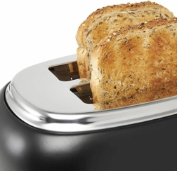 De intuïtieve bediening biedt 6 instelbare niveaus van bruining en praktische functies: ontdooien voor bevroren brood, opwarmen zonder extra roosteren en cancel voor direct stoppen. Voor extra veiligheid en comfort zorgen automatisch uitschakelen, een uitneembare kruimellade voor eenvoudig reinigen en een kabelopbergruimte die het aanrecht netjes houdt.