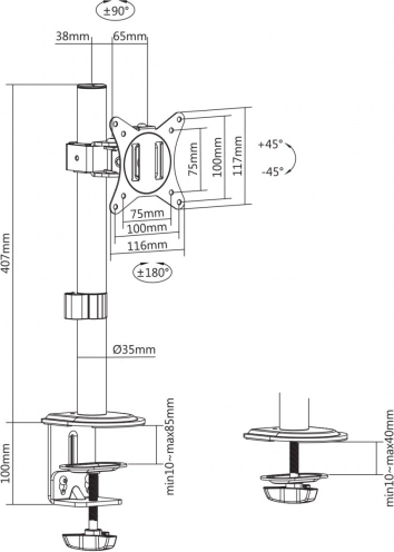 De universele monitorsteun is de ideale oplossing voor de montage van LCD-monitoren van diverse merken met een gewicht tot 9 kg en een diagonaal van 17" tot 32". Ondersteunt VESA-standaarden 75x75 en 100x100 mm voor eenvoudige installatie. Flexibele oriëntatie van de monitor, zowel verticaal als horizontaal, maakt het mogelijk het beeld aan uw behoeften aan te passen. Geïntegreerde kabeldoorvoeren helpen het werkoppervlak netjes en georganiseerd te houden.