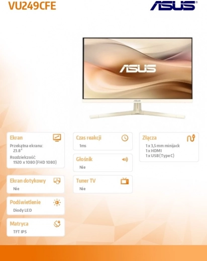 De ASUS VU249CFE-M combineert slanke randen, nauwkeurige kleuren dankzij IPS en de vloeiendheid van 100 Hz voor comfortabel dagelijks gebruik. Met de USB‑C‑poort verstuur je beeld, data en voeding via één kabel, zodat je werkplek netjes en overzichtelijk blijft.
