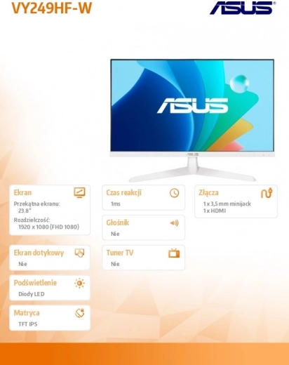 Stijlvolle 23,8" monitor ASUS VY249HF-W met IPS‑paneel en verversingssnelheid van 100 Hz biedt vloeiend beeld, brede kijkhoeken en nauwkeurige kleuren voor werk en entertainment. Dankzij de Full HD-resolutie en het moderne ontwerp in het wit is hij een uitstekende keuze voor zowel kantoor als thuis.