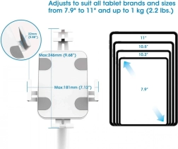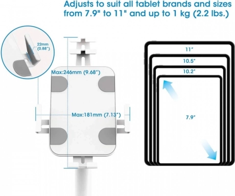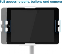 Verstelbare klemarmen passen zich aan tablets van elk merk met een diagonaal van 7,9 tot 11 inch aan en bieden toegang tot poorten, knoppen en voor-/achtercamera’s. Een zachte achterzijde en meegeleverde foam pads voorkomen krassen op het apparaat.