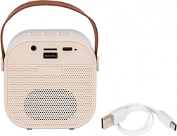Lichte speaker met bruine leren riem voor gemakkelijke verplaatsing, ideaal voor thuisgebruik en onderweg.