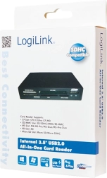 Universele interne geheugenkaartlezer voor montage in een 3,5″ bay van een desktop-pc. Biedt interne USB 2.0‑aansluiting, voeding via de pc en een praktische front-USB‑poort voor snelle aansluiting van randapparatuur.