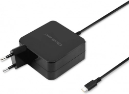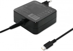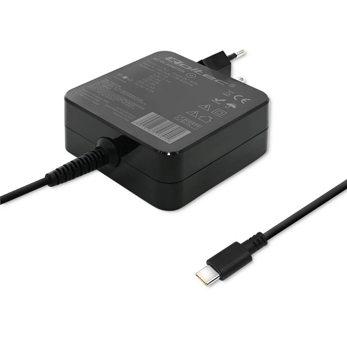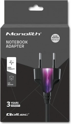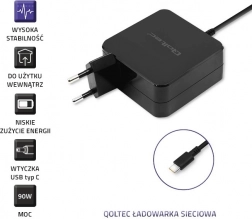 Netlader van Qoltec met een vermogen van 90 W. Hij heeft een ingebouwde kabel met een USB‑C‑connector.
