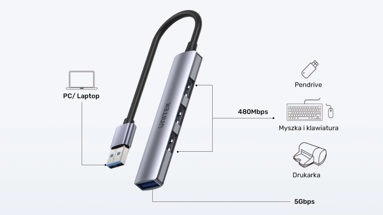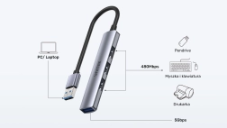 Gebruik de Unitek USB-hub 4-in-1 en vergeet het tekort aan USB-poorten. Hij biedt één snelle USB 3.0-poort met een snelheid van 5 Gbps, ideaal voor externe schijven, en drie USB 2.0-poorten voor minder veeleisende randapparatuur.