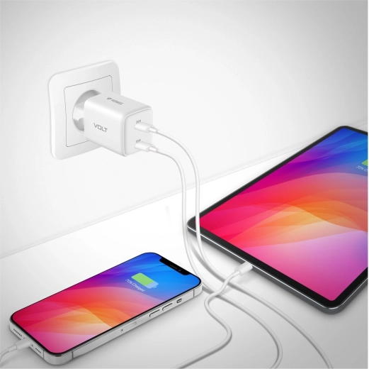 Compacte en krachtige VOLT GaN‑oplader met dubbele USB‑C‑uitgang en een maximaal vermogen van 35 W. Biedt snel en veilig opladen voor een breed scala aan mobiele apparaten, waaronder telefoons, tablets en andere elektronica.