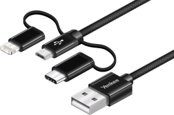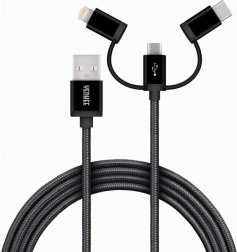 De kabel is uitgerust met drie connectoren – USB‑C, Micro‑USB en Lightning – en biedt daardoor compatibiliteit met diverse apparaten.