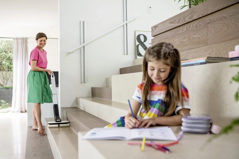 Het hygiënische twee-tanksysteem scheidt schoon en vuil water, zodat je het vuil niet hoeft aan te raken. De mop staat zelfstandig, heeft een afneembare handgreep voor ruimtebesparende opslag en bereikt gemakkelijk plekken dankzij de slanke zuigmond en lage bouwhoogte.