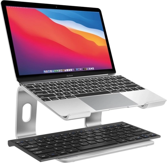 De zilveren laptopstandaard AluBench biedt comfortabel werken dankzij zijn ergonomische constructie. Hij maakt gelijktijdig werken met een extern scherm mogelijk, wat de efficiëntie verhoogt bij het gebruik van meerdere applicaties. Het plaatsen van de laptop op deze verhoogde standaard zorgt voor een betere warmteafvoer en ontlast het koelsysteem van het apparaat.