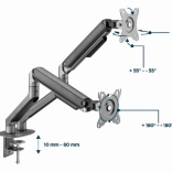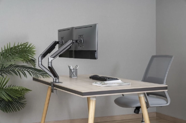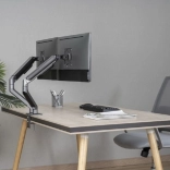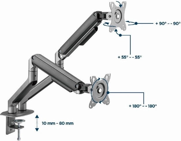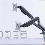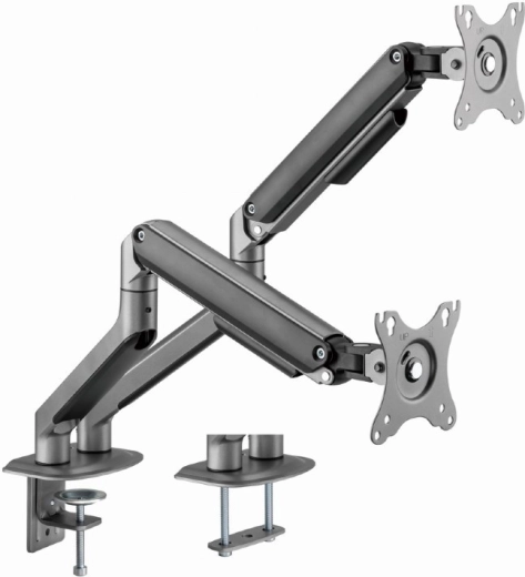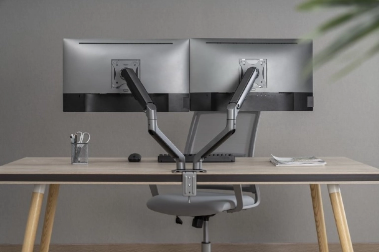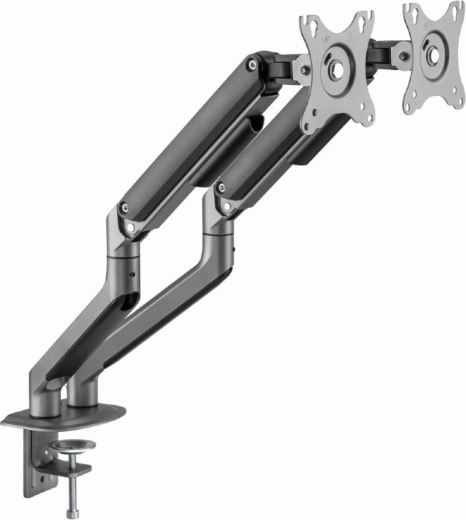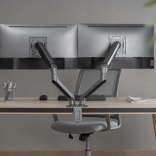 Creëer ruimte op je bureau en geniet van een ergonomische opstelling voor twee schermen. Deze grijze dubbele monitorarm maakt het eenvoudig om hoogte, diepte en hoek in te stellen, zodat ogen, rug en polsen de hele dag comfortabel blijven. Dankzij de soepele werking van de gasveren balanceer je het gewicht van de monitoren precies en pas je de positie met één aanraking aan.