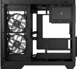 De behuizing wordt zonder ventilatoren geleverd, zodat je de koeling geheel naar wens kunt ontwerpen – van stille airflow tot een krachtige gaming‑setup. Boven- en onderposities bieden plaats aan 360 mm radiatoren, en er is een ARGB‑controller voor tot 9 ventilatoren inbegrepen. Doorlaatbare panelen en stoffilters ondersteunen een efficiënte en schone werking, ook tijdens lange gamingsessies.