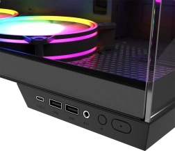 - Modern I/O‑paneel: 2× USB 3.0, 1× USB‑C, combo‑audio en knop voor verlichting
