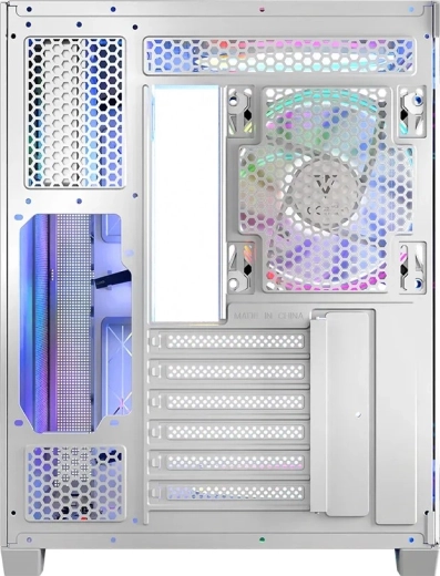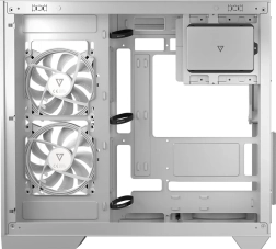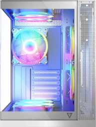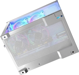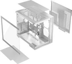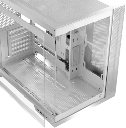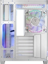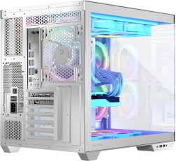 Stijlvolle witte behuizing met gehard glas aan zijkant én voorkant, tweekamerconstructie en ondersteuning voor moederborden met omgekeerde connectors. Biedt USB‑C, ruimte voor 360 mm radiatoren, grafische kaarten tot 400 mm en een CPU‑koeler van 175 mm. Inclusief ARGB‑controller voor tot 9 ventilatoren; de behuizing wordt zonder voorgeïnstalleerde ventilatoren geleverd voor een eigen airflow-configuratie.