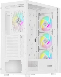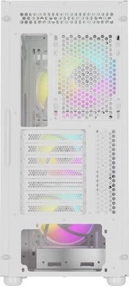 Drie 120mm ARGB‑inlaatventilatoren aan de voorkant en één afvoer aan de achterzijde creëren een positieve druk voor lagere temperaturen en minder stof. Verlichting synchroniseer je eenvoudig via het moederbord.