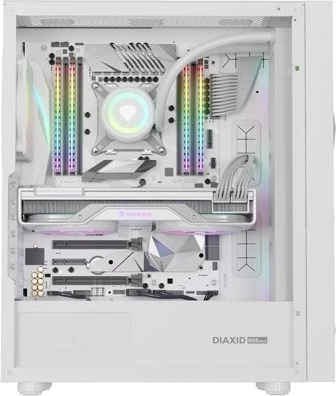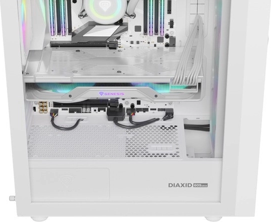 GENESIS Diaxid 605 ARGB combineert hoge koelprestaties met een elegant design. Drie voor- en één achterste 120mm ARGB‑ventilator zorgen voor positieve druk en houden in combinatie met stoffilters vervuiling weg van je componenten. Het fijne mesh‑frontpaneel (~0,8 mm) verhoogt zowel de filterefficiëntie als de luchtstroom.