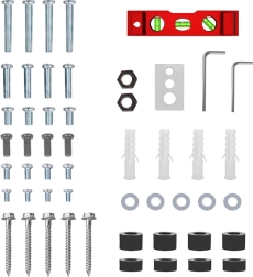 De verpakking bevat een complete montageset met alle benodigde schroeven en pluggen voor een snelle en nauwkeurige installatie.