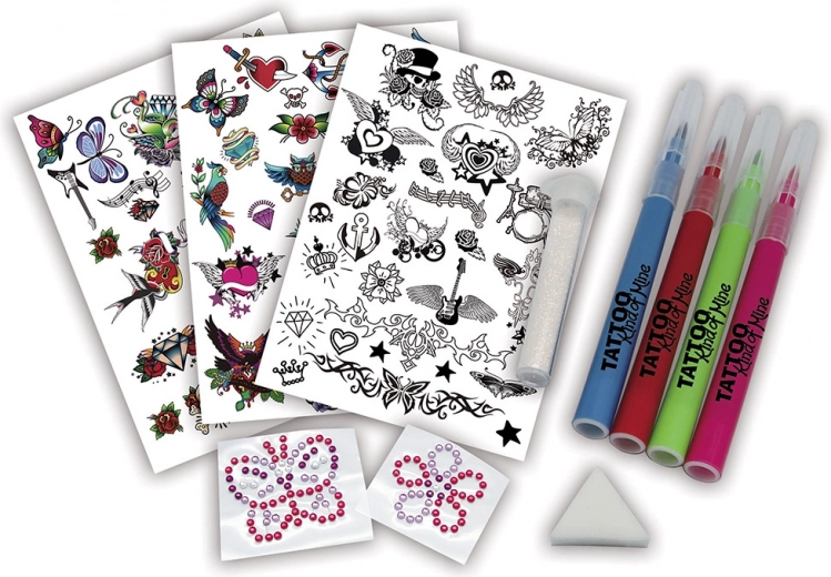 Tattoo set met stiften is geweldig leuk voor kinderen die de wereld van creativiteit en lichaamsversiering willen verkennen. Het bevat alles wat je nodig hebt om unieke ontwerpen te maken.