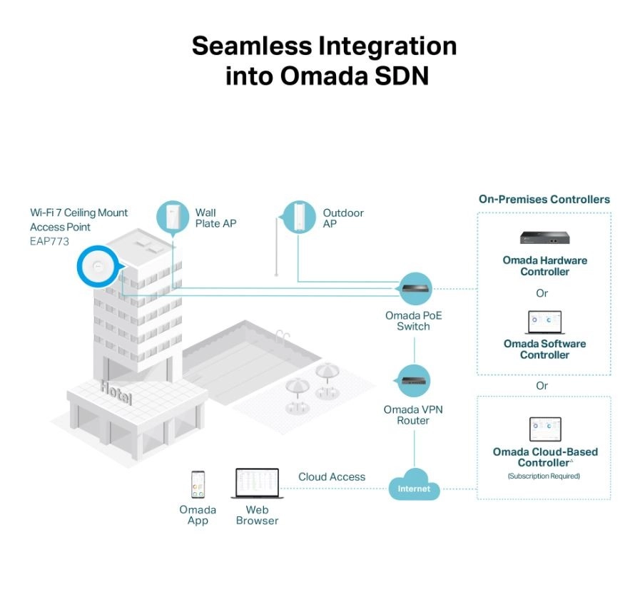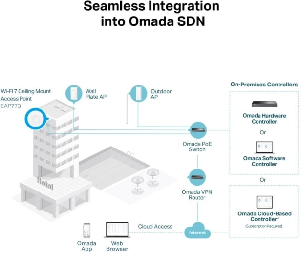 Het apparaat ondersteunt gecentraliseerd beheer, mesh‑netwerk en geavanceerde implementatie‑opties, zodat u de dekking eenvoudig kunt uitbreiden en het beheer van de hele infrastructuur uniform houdt. Een uitstekende keuze voor kantoren, scholen, hotels en retail.