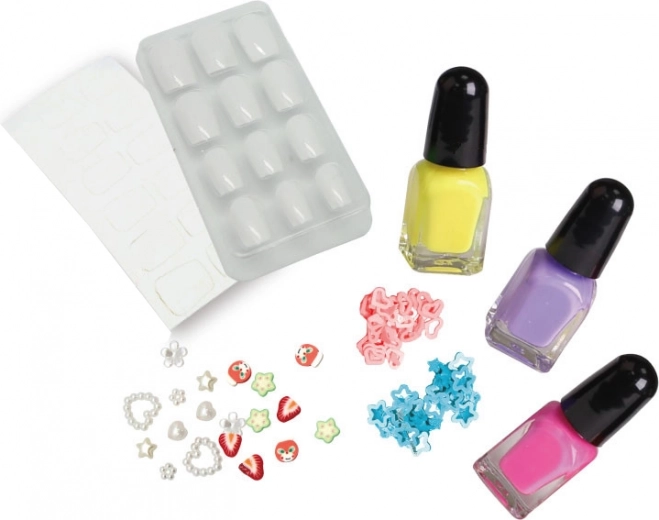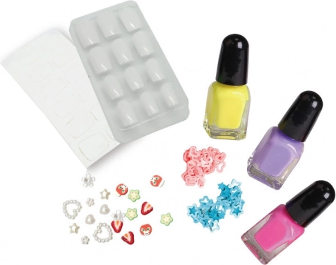 - 3 gekleurde nagellakken, 12 kunstnagels, 12 stickers, 2 soorten glitters, 19 stuks 3D-versieringen, handleiding