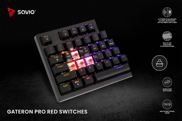 Ontdek het draadloze mechanische toetsenbord Savio PHENIX, dat uitstekende kwaliteit en comfort tijdens gebruik combineert. Met RGB-achtergrondverlichting, die aanpassing aan jouw voorkeuren mogelijk maakt, geniet je van een esthetische én praktische game-ervaring. Het compacte ontwerp met 82 toetsen maakt gebruik in elke omgeving gemakkelijk.