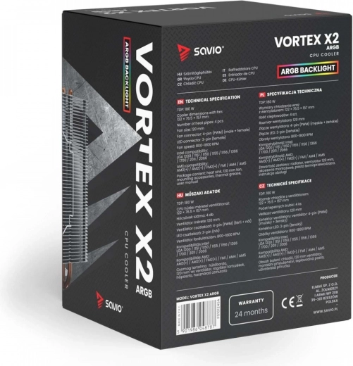 De CPU-koeler Savio Vortex X2 ARGB is een ideale keuze voor wie op zoek is naar een efficiënte en stijlvolle koeloplossing voor de pc. Met vier koperen heatpipes van 6 mm en een 120 mm ventilator koelt hij processors met een TDP tot 180 W.