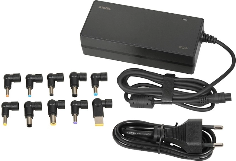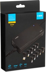 Universele netadapter voor laptops met een vermogen van 120 W en automatische stroominstelling via een microprocessor. Bevat 10 verwisselbare tips voor brede compatibiliteit (ACER, ASUS, COMPAQ, DELL, HP, IBM, LENOVO, LG, SAMSUNG, TOSHIBA). Biedt actieve PFC voor energiebesparing en geavanceerde beveiliging OCP/OPP/SCP/OTP voor veilig opladen.
