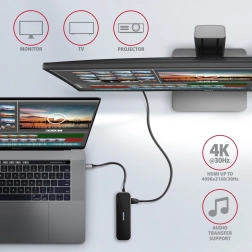 De dedicated USB-C-connector maakt het mogelijk om een notebook of smartphone van stroom te voorzien met Power Delivery 3.0 tot 60 W. Sluit een USB‑C Power Delivery-oplader op de hub aan en bespaar zo een extra poort. Voorwaarde is wel een compatibele laptop en oplader met Power Delivery-ondersteuning.