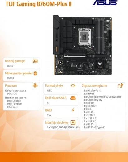 De ASUS TUF Gaming B760M‑PLUS II benut de mogelijkheden van Intel-processoren voor LGA1700 en biedt een uitgebalanceerde mix van gamingfuncties, duurzaamheid en eenvoudige bouw. Dankzij de versterkte stroomvoorziening, kwaliteitskoeling en strenge stresstests is het bord klaar voor lange gamemarathons zonder concessies aan stabiliteit.