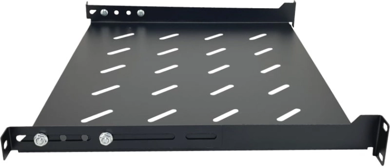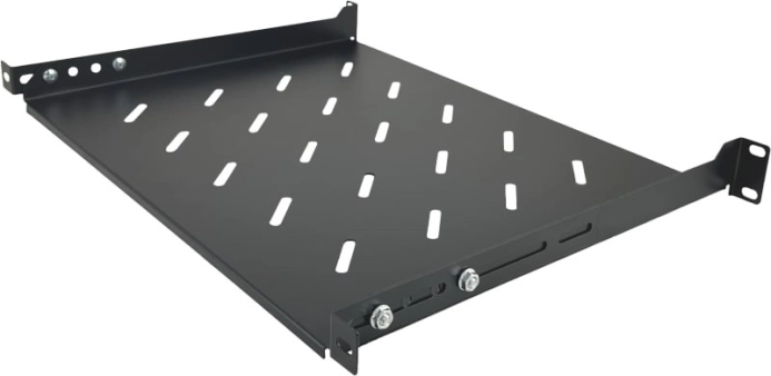 Gemaakt van staalplaat met een duurzame zwarte poedercoating, biedt hij een hoge draagkracht en langdurige stabiliteit. Vier montagepunten garanderen een veilige en stevige bevestiging in het rack.