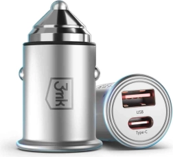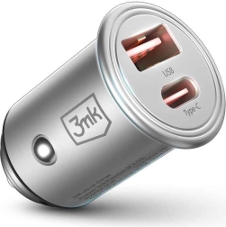 De compacte metalen autolader 3mk Hyper Car Charger met een vermogen tot 45 W laadt je telefoon, tablet en geselecteerde laptops snel op. Laadt twee apparaten tegelijk via USB‑C en USB‑A, biedt geavanceerde bescherming tegen oververhitting, overspanning en overladen en is compatibel met de meeste auto’s met een 12V‑aansluiting.