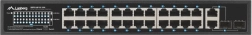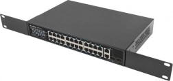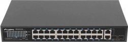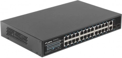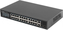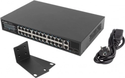 24 PoE+-poorten 10/100 Mb/s leveren voeding en data via één kabel. Het reële PoE-budget van 250 W maakt het mogelijk gelijktijdig tot 16 apparaten volgens 802.3af (15 W/poort) of 8 apparaten volgens 802.3at (30 W/poort) van stroom te voorzien.