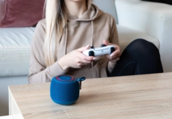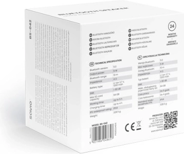 De batterij met een capaciteit van 1200 mAh levert tot 5 uur afspeeltijd, IPX4 spatwaterdichtheid beschermt tegen waternevel, en de compacte afmetingen met een praktisch polsriempje maken meenemen eenvoudig. De luidspreker ondersteunt ook weergave van een SD-kaart (tot 64 GB).