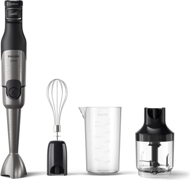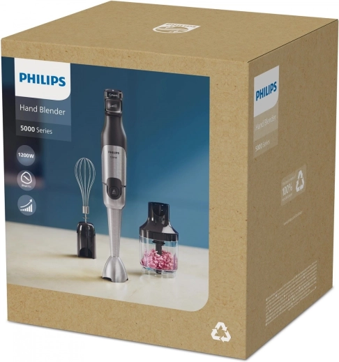 Krachtige PHILIPS staafmixer uit de 5000-serie met een vermogen van 1200 W die zelfs de hardste ingrediënten aankan. Dankzij de ProMix-technologie biedt hij snel en gelijkmatig mixen zonder spatten, vloeiende bediening met SpeedTouch en praktische accessoires waaronder een hakmolen 0,5 l, garde en maatbeker.