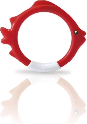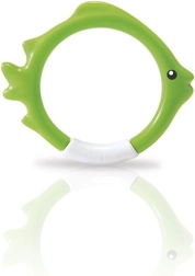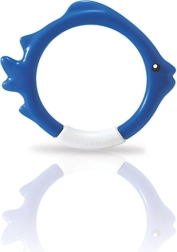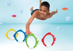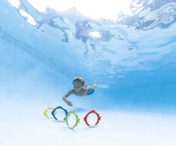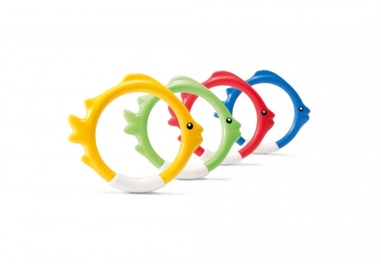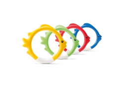 De set duikringen IN TEX in de vorm van vissen is een ideale hulp voor spelenderwijs leren duiken. Dankzij de opvallende kleuren en de stabiele positie op de bodem van het zwembad vinden kinderen gemakkelijk hun doel en oefenen ze graag met adem inhouden en oriëntatie onder water.